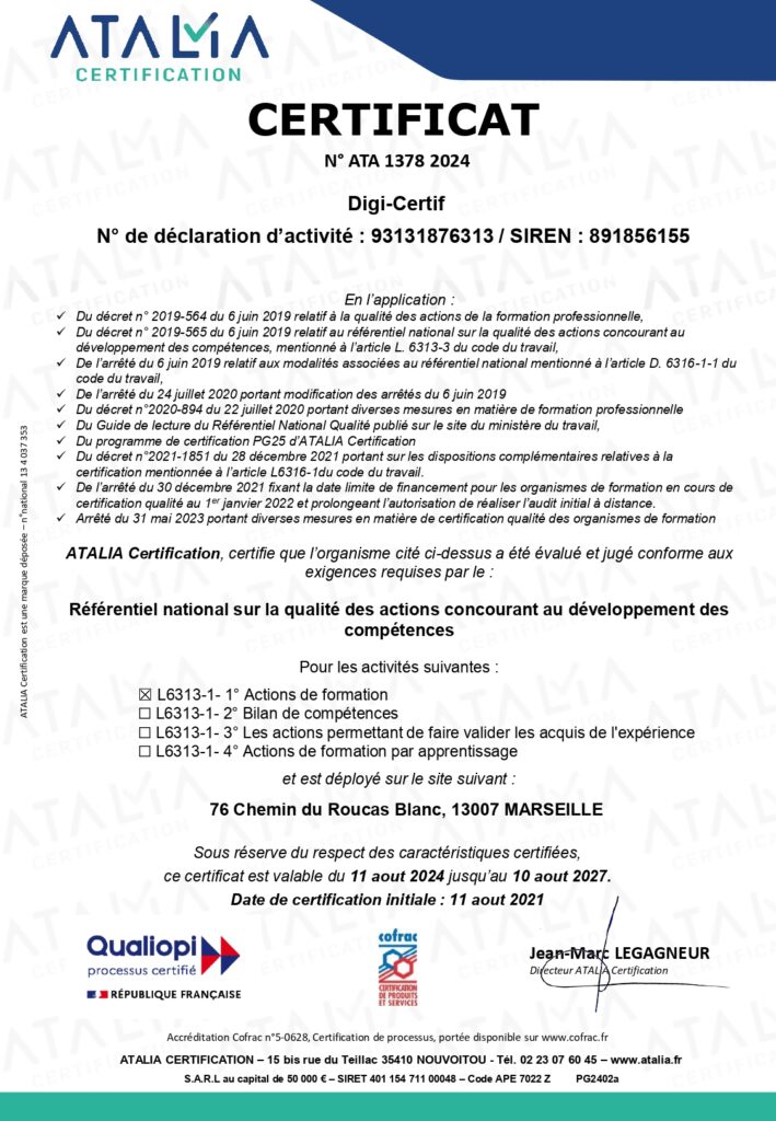 Cet exercice s’est finalement déroulé sans encombre : Digi-Certif obtient sa certification Qualiopi sans aucune non-conformité, ni mineure, ni majeure. C’est un sans faute !